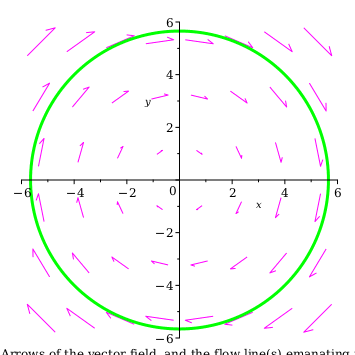 FlowLine⁡VectorField⁡y,−x,4,4,flowlineoptions=thickness=3,color=green,fieldoptions=grid=8,6,color=magenta,view=−6..6,−6..6,scaling=constrained