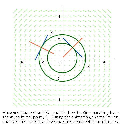 The FlowLine(F, G) calling sequence displays the flow line of the vector field F starting at the point(s) G.