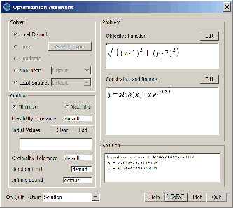 Context Panel: Optimization≻Optimization Assistant (The Optimization Assistant launches with the objective function and constraint equation inserted into the appropriate fields.)