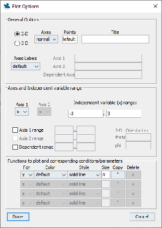 Context Panel: Plot Builder≻2-D plot Set −3≤x≤3 view: axis[2]≻0,2.5 2-D Options: scaling≻constrained