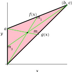 The intersection of y1 and y2 is b/3,a+c/3, the centroid. Moreover, evaluating y3 at x=b/3 gives a+c/3, so all three medians meet at the centroid.