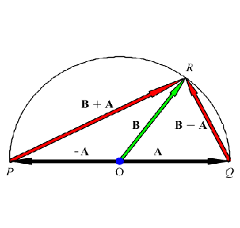 Angle PRQ is inscribed in the semicircle shown in Figure 1.3.12(a). Vectors A and −A are along the diagonal, and vector B, connecting points O (the center of the circle) and R, is along a radius.