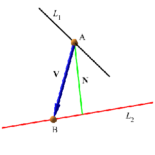 The traditional "textbook" approach to finding the distance between skew lines is vector-based. An arbitrary vector between the two lines is projected onto the common normal. The length of this projection is the distance between the lines. Since points A and B are respectively on each line, the vector V=B−A is a convenient vector to project onto the common normal.