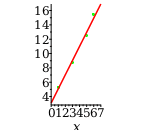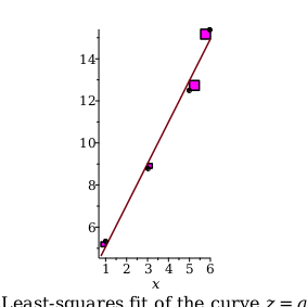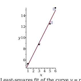 Choose a and b so that the line y=a x+b minimizes S=k=1na xk+byk2, the sum of squares of the deviations from the points 1,5.3,3,8.8,5,12.5,6,15.4 to the line. Such a line is called the "least-squares" line.