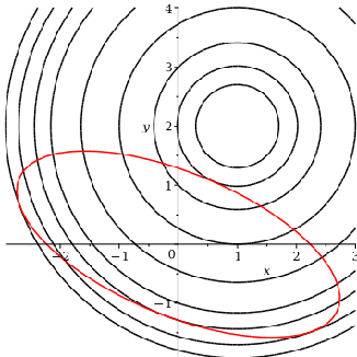 use plots in module() local p1,p2,p3; p1:=contourplot((x-1)^2+(y-2)^2,x=-3..3,y=-2..4,color=black,contours=[.5,1.0442,2,4,7,10,11.8137,13.715,15.4267]); p2:=implicitplot(x^2+2*x*y+3*y^2-5 = 0,x=-3..3,y=-2..2,color=red); p3:=display(p1,p2,scaling=constrained); print(p3); end module: end use: