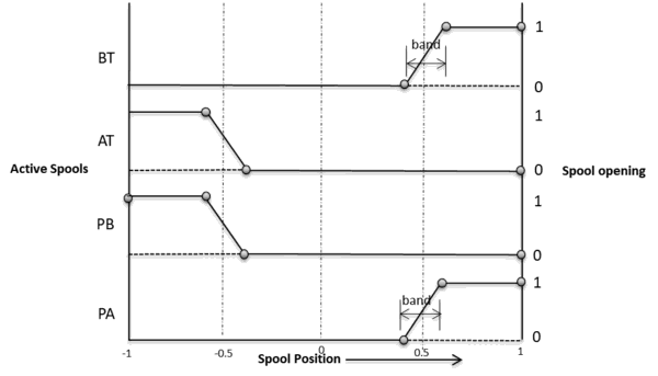 The DCV 43 Close component is a four-port, three-position valve. The area between pairs of ports varies as a function of the spool input signal, s, and the parameters Amax, Amin, and band. The following table gives the areas for three values of the spool input.