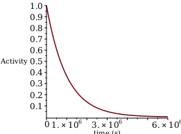 A__0≔1;plot⁡A,t=0..6.⁢106,labels=time (s),Activity