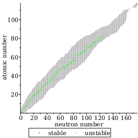 plotsdisplay⁡isos_st_p,isos_unst_p,symbol=CROSS,labels=neutron number,atomic number,labeldirections=HORIZONTAL,VERTICAL