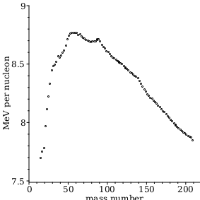 plotspointplot bindEn, symbol=CIRCLE, symbolsize=5, labels=mass number, MeV per nucleon, labeldirections=HORIZONTAL,VERTICAL, view=0..220, 7.5..9 ;