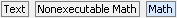 In addition, the context bar above your document now has three buttons that reflect these three states. These function as an indicator of your current entry mode, and can be used to switch modes. Click on the Text, Nonexecutable Math, or Math button to switch to that entry mode.