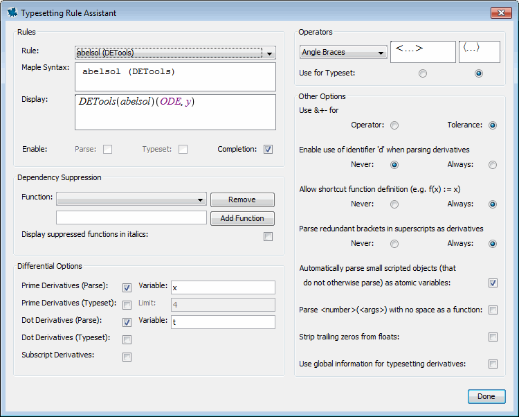 After applying rules, click Done. The typesetting rules apply only to the current Maple session. Typesetting rules are not retained after issuing a restart.
