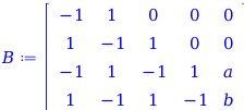 B := Matrix([[-1, 1, 0, 0, 0], [1, -1, 1, 0, 0], [-1, 1, -1, 1, a], [1, -1, 1, -1, b]]);