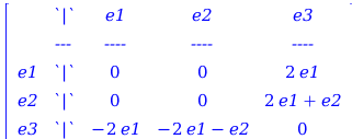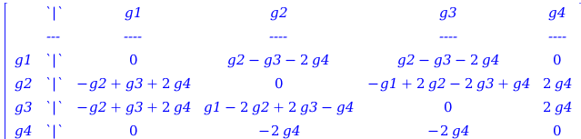 L3 ≔ e1,e2=e2−e3−2⁢e4,e1,e3=e2−e3−2⁢e4,e2,e3=−e1+2⁢e2−2⁢e3+e4,e2,e4=2⁢e4,e3,e4=2⁢e4