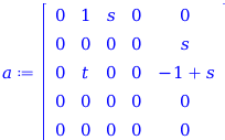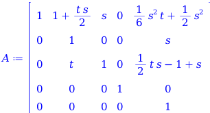A := Matrix([[1, 1 + 1/2*t*s, s, 0, 1/6*s^2*t + 1/2*s^2], [0, 1, 0, 0, s], [0, t, 1, 0, 1/2*t*s - 1 + s], [0, 0, 0, 1, 0], [0, 0, 0, 0, 1]]);