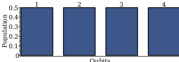 The new state entangles a state of 4 "down" qubits with a state of 4 "up" qubits. Like Schrodinger's cat, our state is half up and half down. The probability of being "up" in each qubit is 1/2 as we can see from the QubitPopulationsPlot command