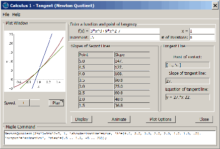 In Figure 2.1.4 the Tangent tutor is configured for the animation seen in Figure 2.1.3. The animation in the tutor is launched by pressing the "Animate" button in the lower portion of the tutor. Alternatively, pressing the "Display" button would display a collection of secant lines whose endpoints and slopes are listed in the table in the tutor. Note that the slope and equation of the tangent line are also given in the tutor. The NewtonQuotient command at the bottom of the tutor is the command used to generate Figure 2.1.3.