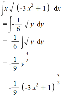 An alternate approach to making the substitution y=1−3 x2 starts with the recognition that dy=−6 x dx, and that outside the square root there's an x, but not a factor of −6. So, insert this factor inside the integral, and compensate with a factor of −1/6 outside the integral, to obtain −16∫yⅆy immediately.