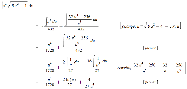 The change of variables selected by the tutor leads to −u3+32/u−256/u5/432, provided u≥2, and this corresponds to x≤−2/3. Since the tutor does not have provision for routine simplifications, it takes several steps, including invocation of the Rewrite rule to massage the expression into a form where the power rule of integration applies.