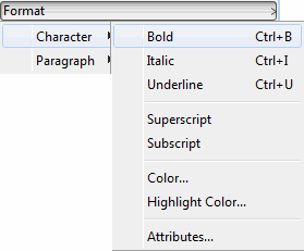 The Format→Character menu provides access to the following quick formatting features: Bold, Italic, Underline, Superscript, Subscript, Font Color, and Highlight Color.