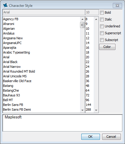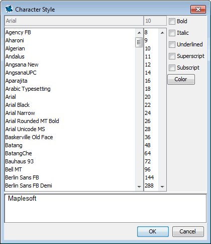 You can also change various character attributes such as font, character size, style, and color in one dialog.