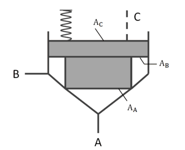 The pressure at port C, in addition to the force of a preloaded spring, act to close the valve while the pressure at port A and B act to open the valve.