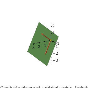 To visualize planes and their related vectors in three dimensions, the Student[LinearAlgebra] package provides the PlanePlot command. This command allows you to specify a plane in different ways. It also displays the plane and, optionally, a normal vector, a pair of basis vectors, a vector to a point on the plane from the origin, and the vector from the origin to the closest point on the plane to the origin.