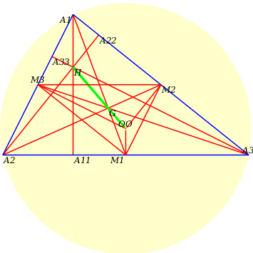 Theorem: The orthocenter H, the circumcenter OO, and the centroid G of a triangle A1A2A3 are collinear and HG = 2*GOO.