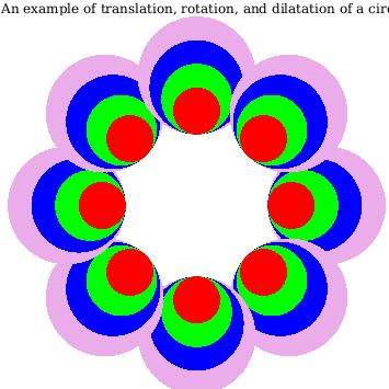 foritondoAnglei≔2⁢π⁢inenddo:dsegment⁡dseg,point⁡A,0,0,point⁡B,4,0:point⁡o,0,0:circle⁡c,o,1:homothety⁡c1,c,32,point⁡M,−1,0:homothety⁡c2,c,2,point⁡M,−1,0:homothety⁡c3,c,52,point⁡M,−1,0:translation⁡t,c,dseg:translation⁡tt,c1,dseg:translation⁡ttt,c2,dseg:translation⁡tttt,c3,dseg:forito8dorotation⁡t‖i,t,Anglei,counterclockwise,o;rotation⁡tt‖i,tt,Anglei,counterclockwise,o;rotation⁡ttt‖i,ttt,Anglei,counterclockwise,o;rotation⁡tttt‖i,tttt,Anglei,counterclockwise,oenddo:draw⁡seq⁡op⁡t‖i⁡color=red,tt‖i⁡color=green,ttt‖i⁡color=blue,tttt‖i⁡color=plum,i=1..n,printtext=false,filled=true,axes=none,title=An example of translation, rotation, and dilatation of a circle
