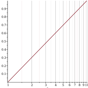 semilogplot⁡log10⁡x,x=1..10,axis1=gridlines
