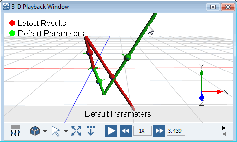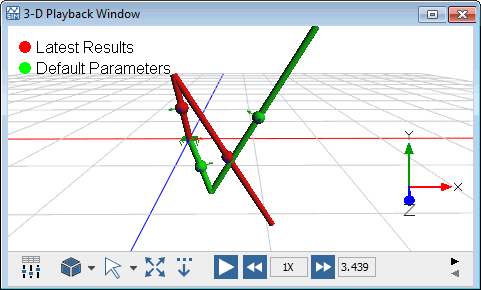 Only visible results are shown in the 3-D Playback Window. See Viewing Stored Simulation Results for information on setting the visibility of a simulation result.