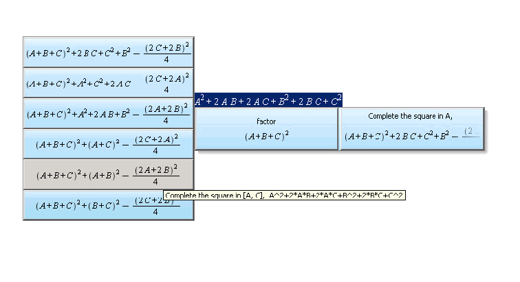 Selecting the output expression above produces the Smart Pop-up menu after a brief pause. Completing the square on the given example may be done in terms of one or several of the variables. If the mouse pointer hovers over the appropriate item then the relevant submenu appears. For individual action items (choices within that submenu) a tooltip will further describe the suggested operation.