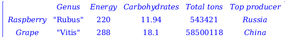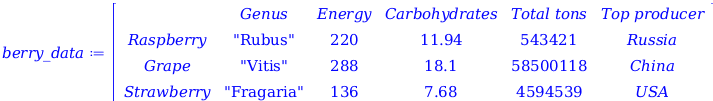 berry_data := DataFrame([genus, energy, carbohydrates, total_tons, top_producer], columns = [Genus, Energy, Carbohydrates, `Total tons`, `Top producer`], rows = Labels(energy));