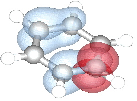 For a particle placed in the 2pz orbital of one of the carbon atoms, whose density is shown in nautical red, the density of the hole is shown in light nautical blue.