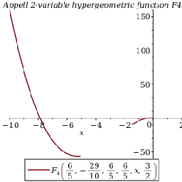 For an analogous reason, when the a and/or both b1 and b2 parameters entering the pochhammer functions in the numerator of the series are non-positive integers, the series will truncate and AppellF4 will be polynomial. As is the case of the hypergeometric function, when the pochhammers in both the numerator and the denominator have non-positive integer arguments, AppellF4 is polynomial if the absolute value of the non-positive integers in the pochhammers of the numerator are smaller than or equal to the absolute value of the non-positive integer (parameters c1,c2) in the pochhammers in the denominator, and singular otherwise. Consult the FunctionAdvisor for comprehensive information on the combinations of all these conditions. For example, the singular cases happen when any of the following conditions hold
