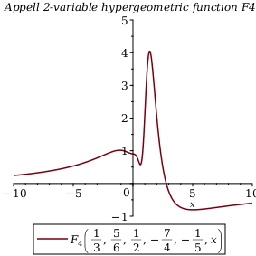 A distinction is made between the AppellF4 doubly hypergeometric series, with the restricted domain of convergence shown above, and the AppellF4 function, that coincides with the series in its domain of convergence but also extends it analytically to the whole complex plane.