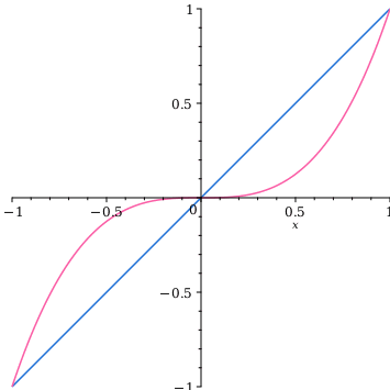 plot⁡x,x3,x=−1..1,color=DivergeRainbow 10,DivergeRainbow 200