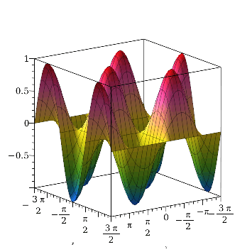 plot3d⁡sin⁡x⁢cos⁡y,x=−32⁢π..32⁢π,y=−32⁢π..32⁢π,colorscheme=DivergeRainbow
