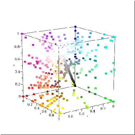 Exploreplots:-displayColorTools:-SpatterPlot3dColorTools:-GetPalettep,space=c,symbol=box,orientation=piecewisec=Laborc=Luv,172,12,145,55,75,0,view=piecewisec=RGBorc=HSV,0..1,0..1,0..1,c=xyY,0...0.7,0...0.7,0...1.0,default,default,default,projection=0.78,parameters=p=X11,HTML,Resene,Generic,CSS,Niagara,MapleV,OldPlots,Mono,label=Palette,c=RGB,HSV,Lab,Luv,xyY,label=`Color Space`,size=500,500,placement=bottom,orientation=vertical,fillcolor=#BCBCBC,componentbackground=#777777,title=Color Palette SpatterPlots