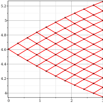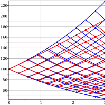 The BlackScholesBinomialTree(S0, r, d, v, G) calling sequence returns a binomial tree approximating a Black-Scholes process with the specified parameters. When r, d, and v are constant and the time grid is homogeneous, the BlackScholesBinomialTree constructs the standard Cox, Ross, and Rubinstein binomial tree. In the general case the binomial tree is constructed as follows: