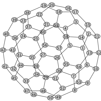 SoccerBallGraph() creates the soccer ball graph on 60 vertices, also known as the truncated icosahedron graph, the buckminsterfullerene graph, or the buckyball graph. This is a planar 3-regular graph with no triangles.