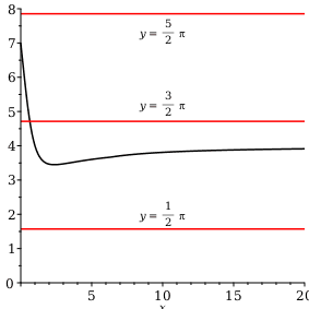 G:=(abs(4-x^(3/4)) + 4*x^2-2*x+3)/(x^2+1): p1:=plot([G,Pi/2,3*Pi/2,5*Pi/2],x=0..20,color=[black,red,red,red],view=[0..20,0..8]): p2:=plots:-textplot({[10,2,typeset(y=Pi/2)],[10,5.2,typeset(y=3*Pi/2)],[10,7.3,typeset(y=5*Pi/2)]}): plots:-display(p1,p2);