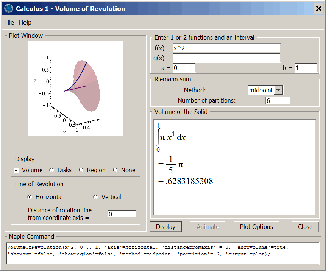 Nevertheless, Figure 5.2.5(c) shows the Volume of Revolution tutor computing the volume of the solid by disks. The figure of the solid is correct, as is the computed volume. Note the selection of the horizontal axis of rotation, and frame and scaling options applied in the Plot Options panel.