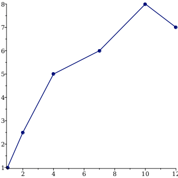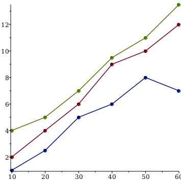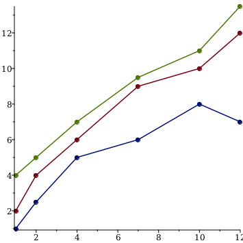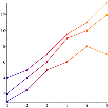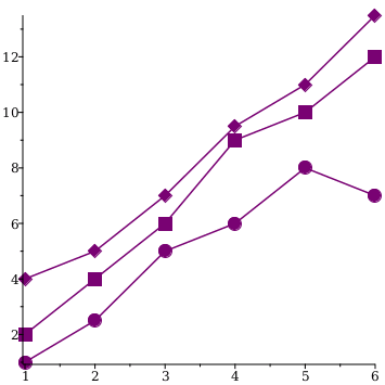 2-D point plots: The first calling sequence plots a single collection of x-values against one or more collections of y-values. Alternatively, the first argument Xr can be a range a..b, indicating that the x-values are equally distributed over this range.