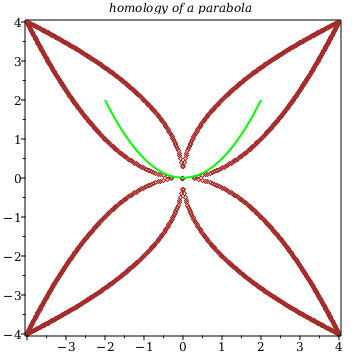 draw⁡p2,p3,p4,p5,p1⁡color=green,style=LINE,thickness=2,numpoints=50,style=POINT,numpoints=200,color=brown,title=`homology of a parabola`