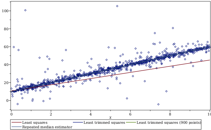 plotsdisplaypp, plotls_regression_result, lts_regression_result, lts_900_regression_result, rme_regression_result, X=0..10, legend=Least squares, Least trimmed squares, Least trimmed squares (900 points), Repeated median estimator, view=0..10, −10..110,size=0.7 , golden;