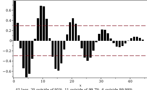 The Correlogram command computes autocorrelations of a data set and displays the result as a column plot with dashed lines indicating the lower and upper 95% confidence bands for the normal distribution N(0,1/L), where L is the size of the sample 'X', and a caption reporting how many of the displayed columns lie outside of the bands of plus or minus 2, 3, and 4 standard deviations respectively. AutoCorrelationPlot is an alias for the Correlogram command.