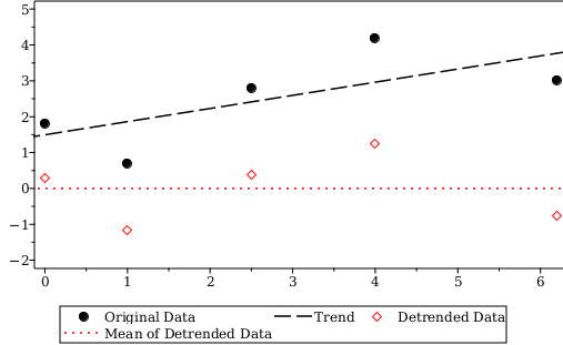 plots:-display⁡ ScatterPlotdata,color=Black,legend=Original Data,symbol=solidcircle,symbolsize=15, plotlm,color=Black,legend=Trend,linestyle=dash, ScatterPlotdata..,1,detrend_data,color=Red,legend=Detrended Data,symbol=diamond,symbolsize=15, plotMeandetrend_data,color=Red,legend=Mean of Detrended Data,linestyle=dot,view=min⁡data..,1−0.1..max⁡data..,1+0.1,default,size=0.5 , golden