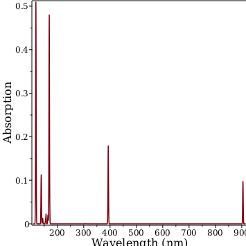 spectra ≔ ExcitationSpectramol, method=DensityFunctional,nstates=1, showtable=true: