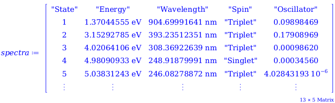 spectra ≔ ExcitationSpectramol, showtable=true: