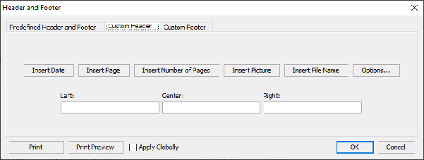 In the Custom Header or Custom Footer tabs, you can define a header or footer.